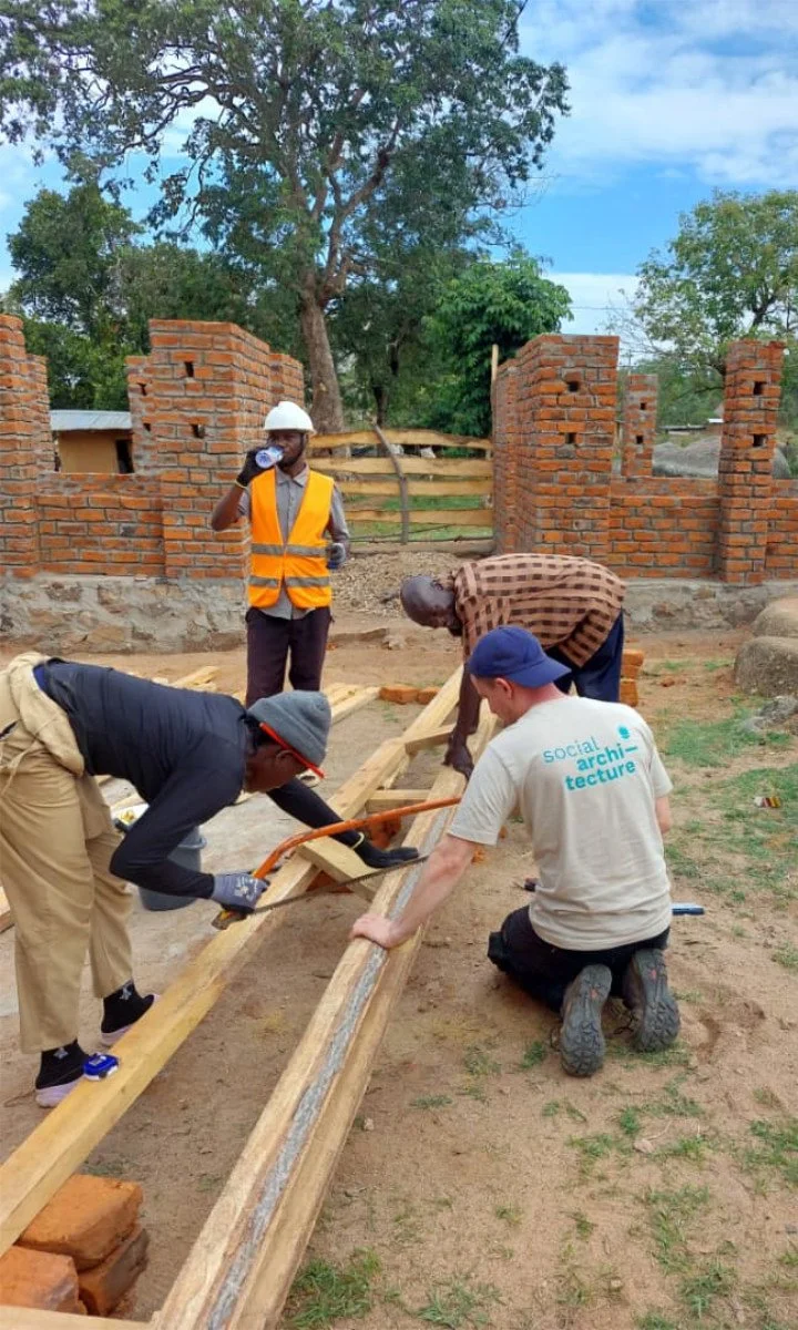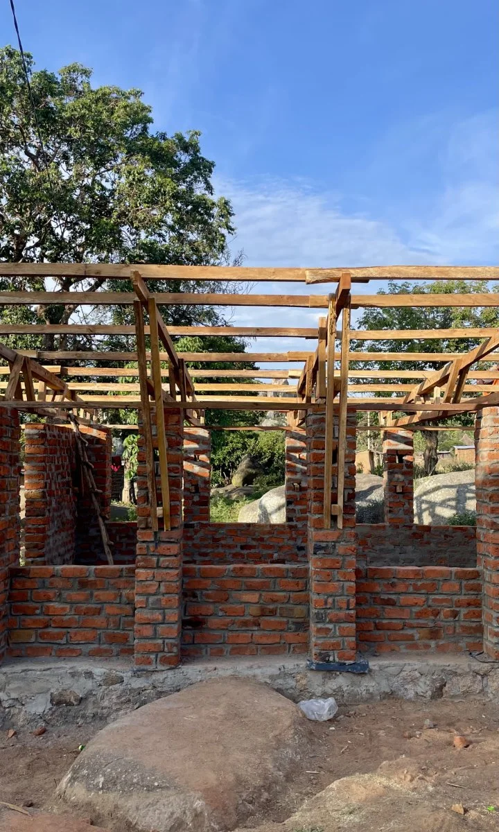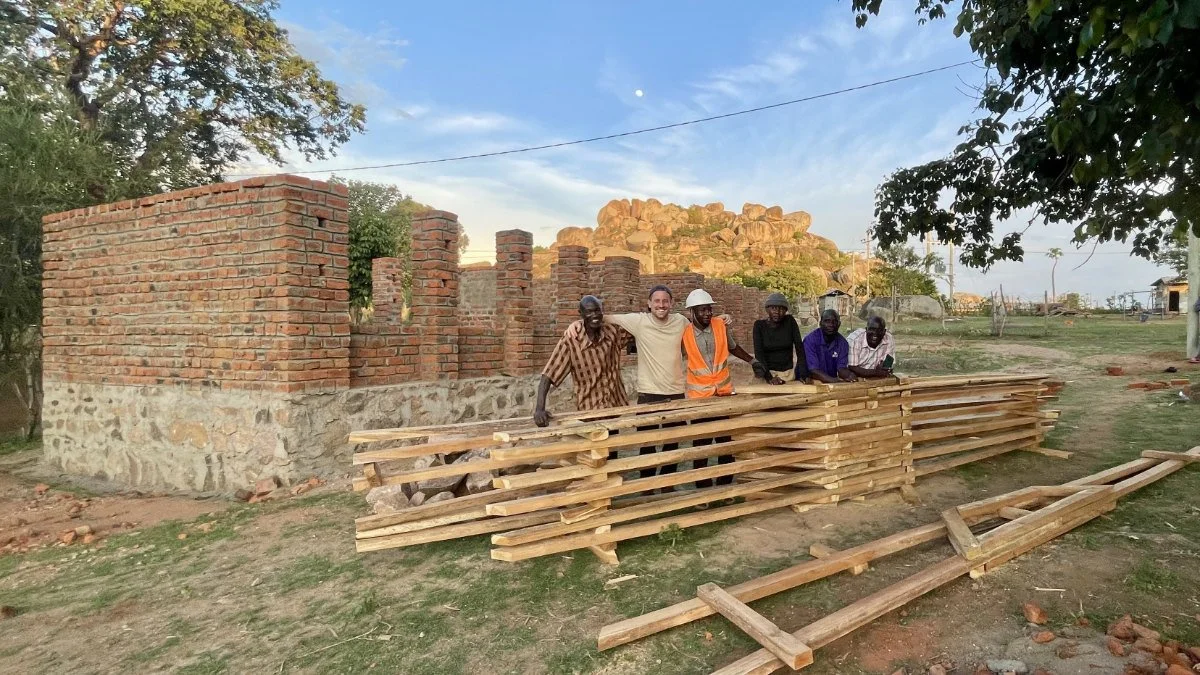 Während das Fundament und Mauerwerk in Eigenregie und mit digitaler Bauleitung realisiert wurde, reiste Oliver im November 2025 für einen ersten Besuch nach Lolwe und unterstützte vor Ort den Bau des Dachstuhls.